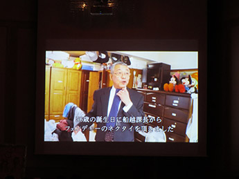 会の冒頭では、創業当初からの会社の歩みと共に社長の足跡も凝縮された動画を放映。中には社長のご自宅や愛猫が紹介される一幕も(笑)。