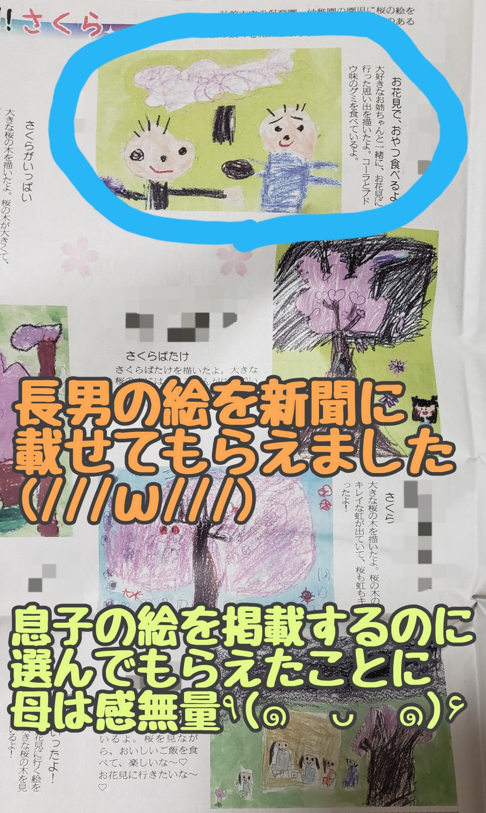 4月末の新聞に、保育園から提出したさくらの絵の中から、長男の絵を選んでもらえました(੭ु´・ω・`)੭ु⁾⁾