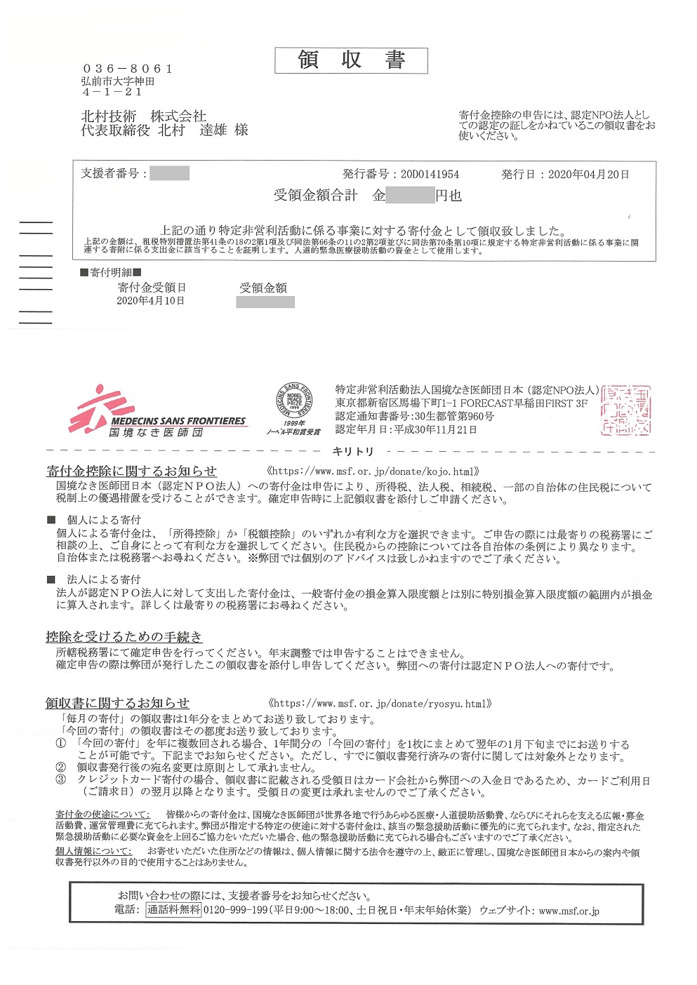 そこで北村技術では国境なき医師団への寄付を継続して行わせていただいております。