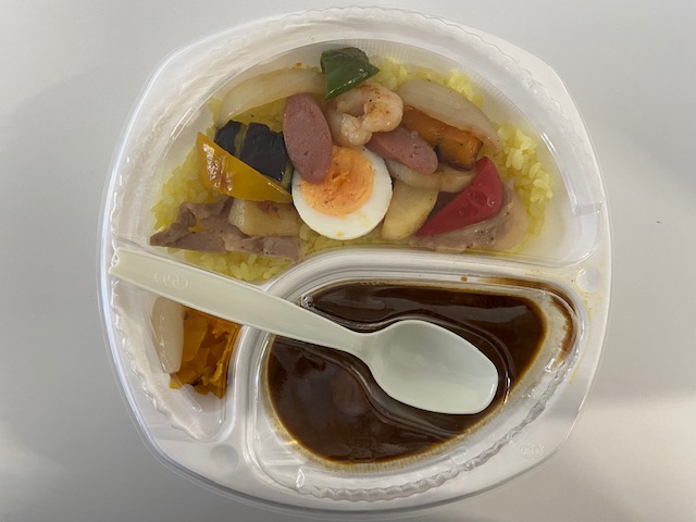 ピリ辛カレールーの中に1個隠れてある肉だんご、ぷりぷりのエビにシャキシャキパプリカ・・・・????