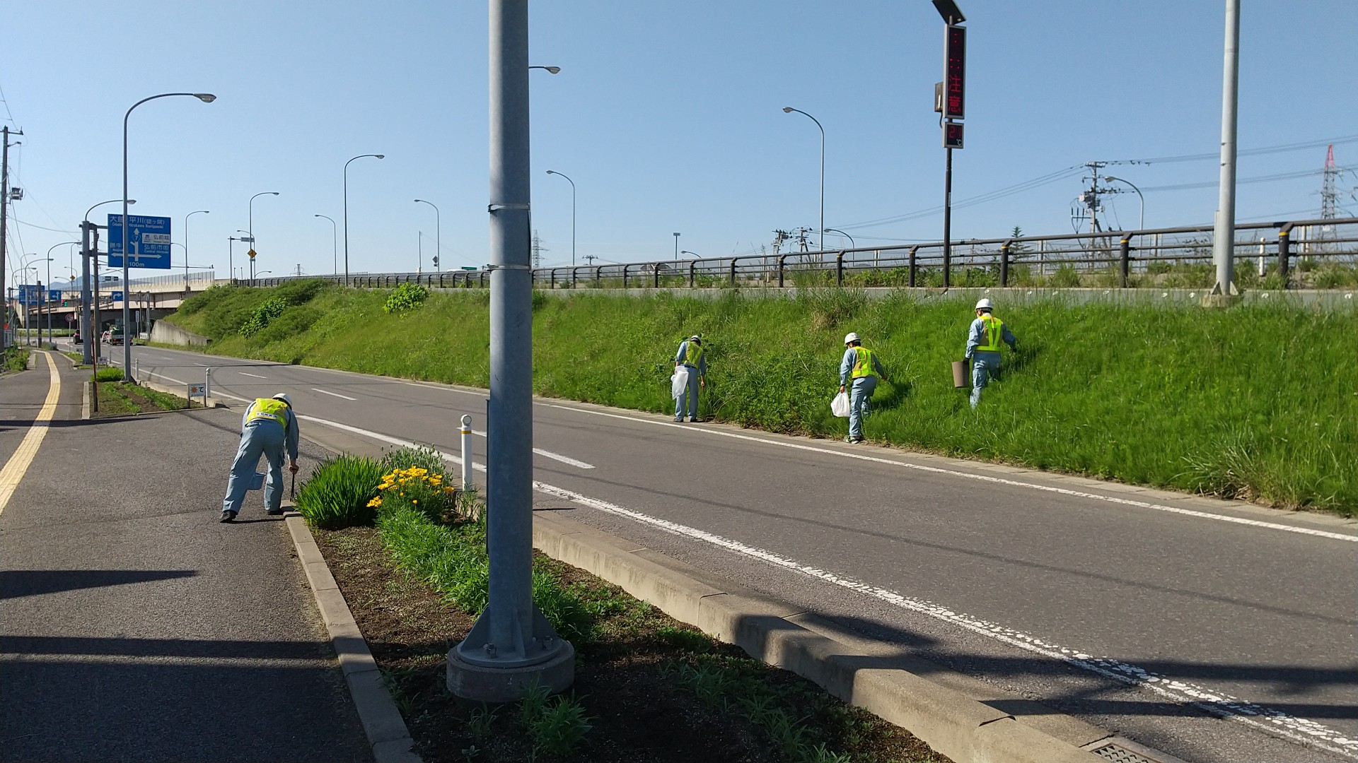 私たちは会社前の道路でごみ拾いを行うときは、通行車両との接触のないようにヘルメット、チョッキを着用しています。
