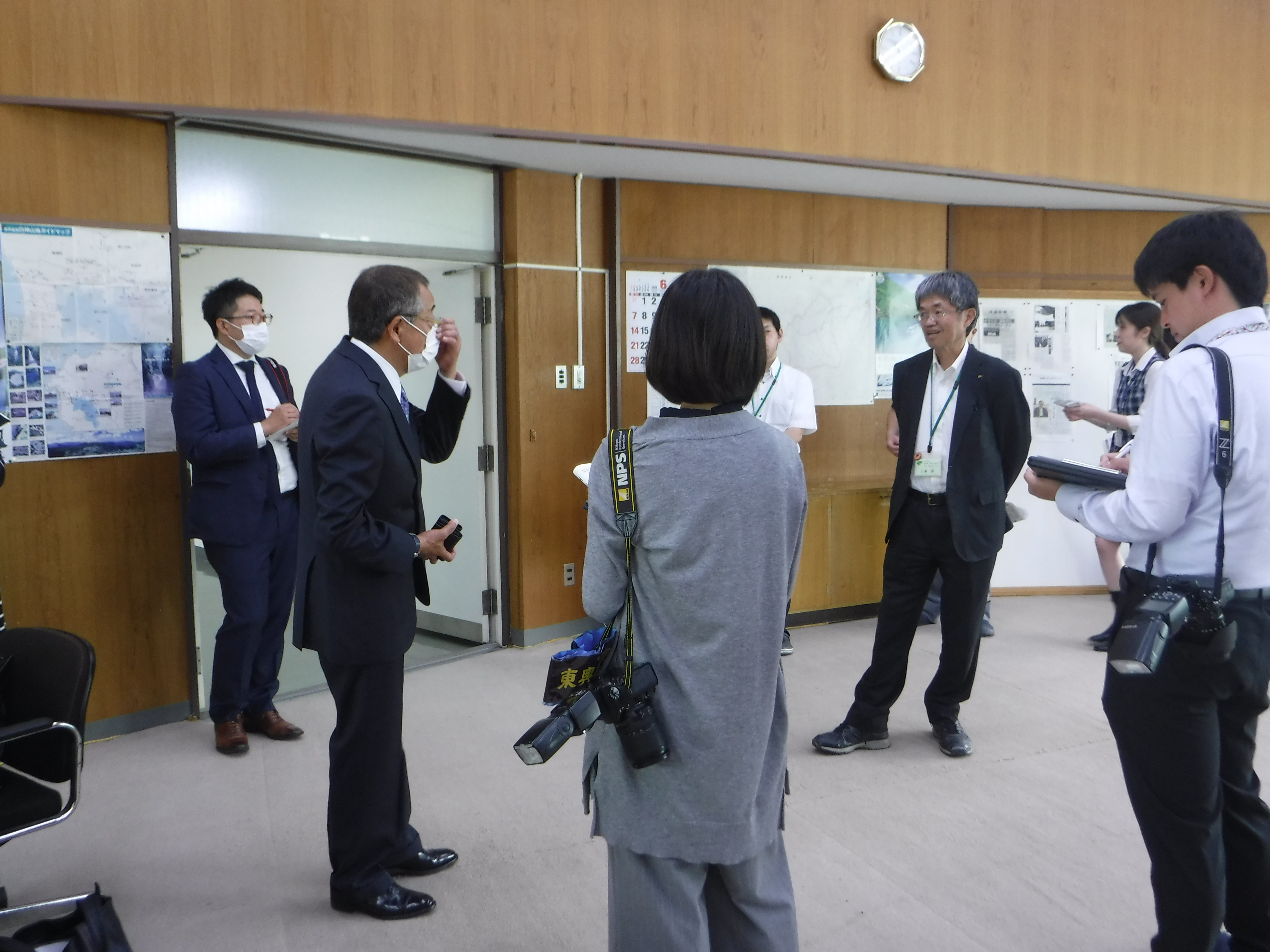 贈呈式が終了した後も、記者の方々に囲まれる社長。