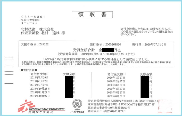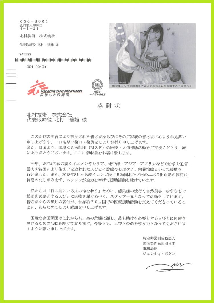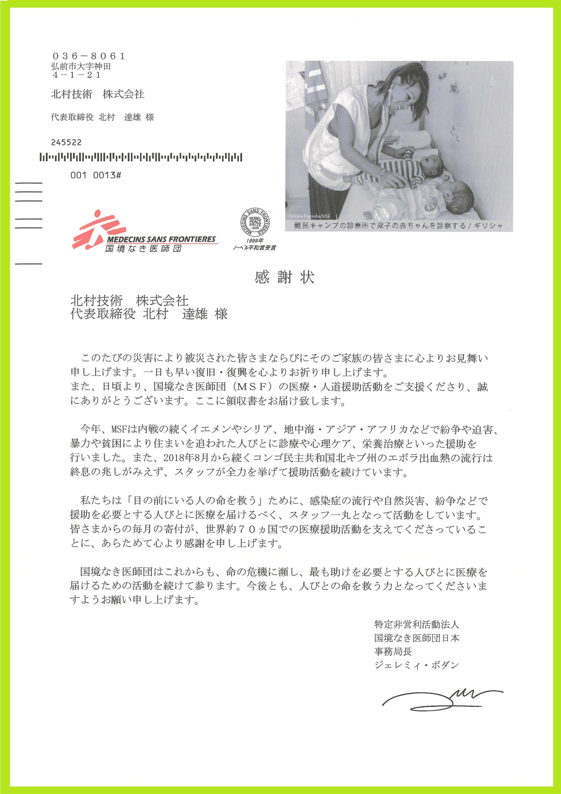 そして北村技術はこのような活動に少しでも役に立ててもらいたいと思い毎月支援をしています。