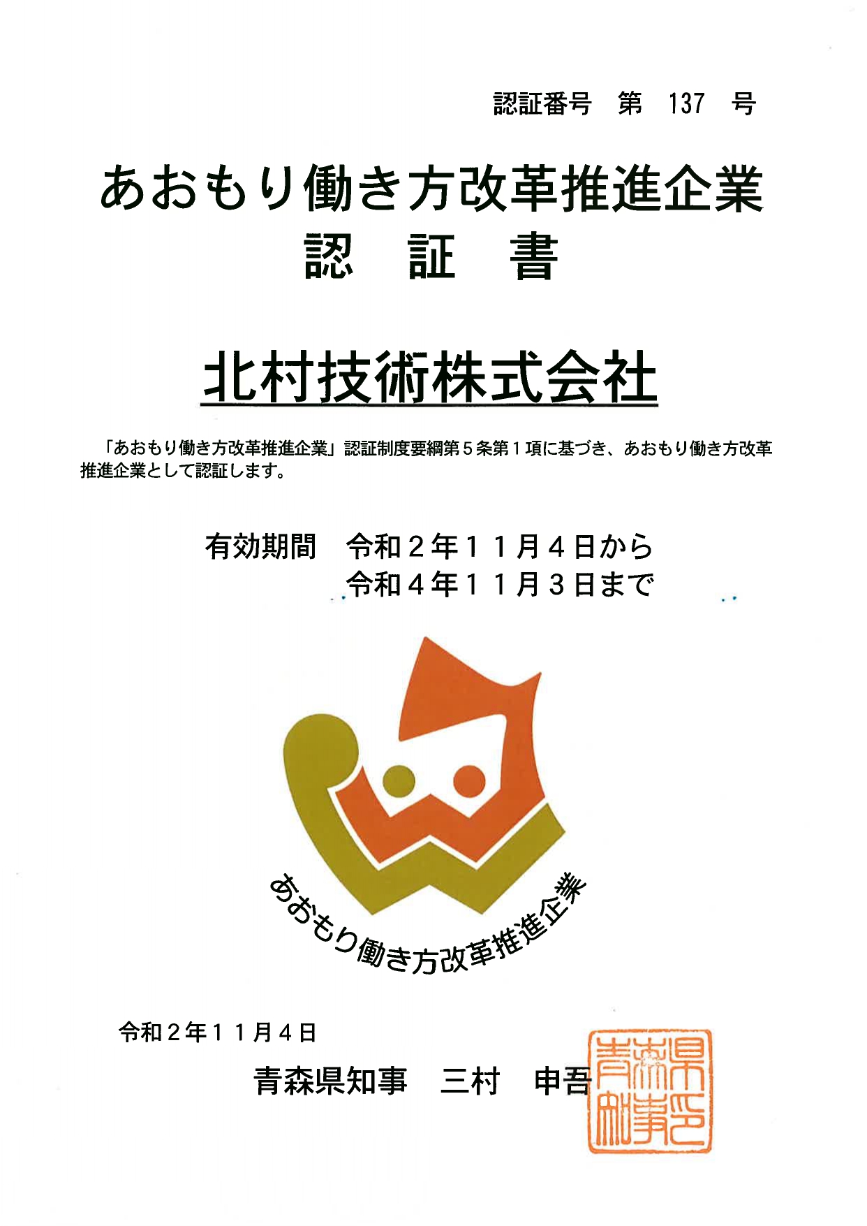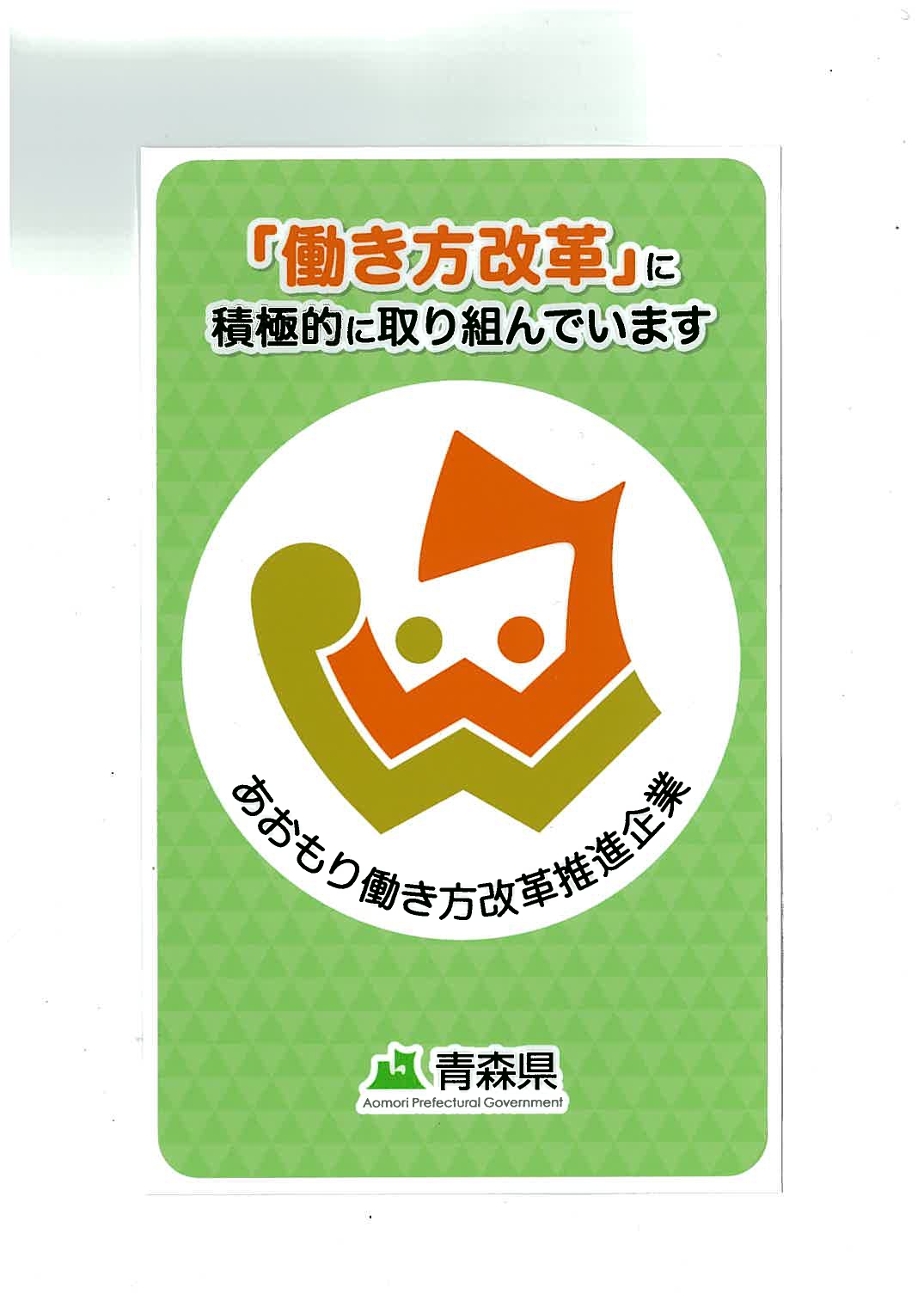 この度、青森県知事より「あおもり働き方改革推進企業」として認定を頂きました。
