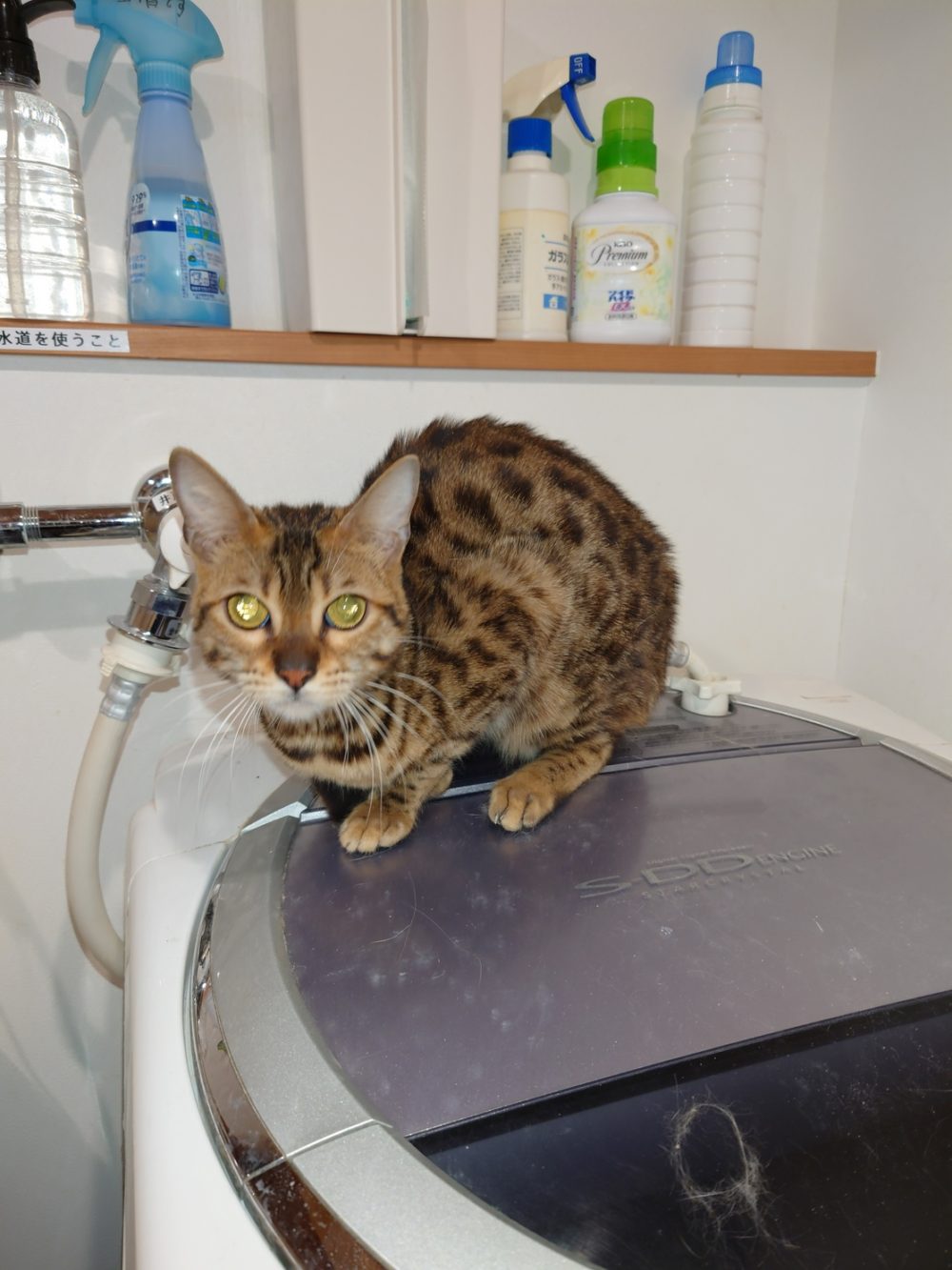 続いてはベンガルの娘=^_^=『桜🌸ちゃん』1才半のメス(=^・^=)、売れ残り?来て間もなくの緊張した表情?ゲージの中から広い20坪の猫専用ハウスと50坪の天然芝付き庭へ。。。ちょっと痩せて売れ残り?人間のエゴです、我が家へ来ればすぐに元気に=^_^=。。。猫専用洗濯機の上にて
