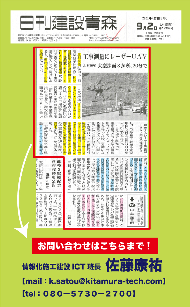 北村技術建設ICT佐藤康祐班長のもとレーザードローンを採用した計測を行いました!!