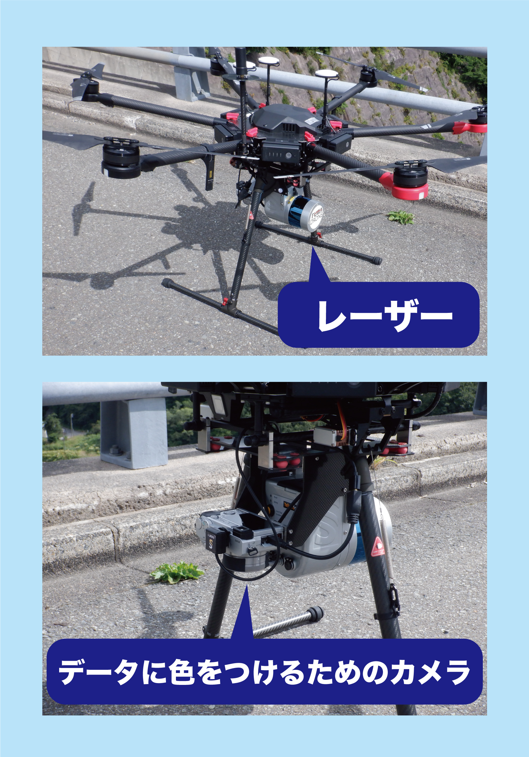 レーザードローンなので機体の下には計測用のレーザーデータに色を付けるためのカメラが付いています📷✨すごいですね(*’▽’)