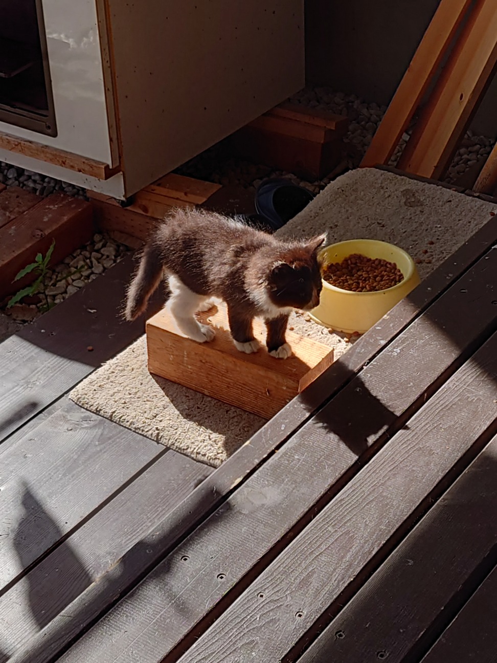 先月一足早く生まれた野良の子供たち(=^・^=)が我が家のご飯を食べに来ました。毛がモフモフ、我が家のマキ小屋で毎日過ごしていて雨の日の寒さにも耐え5匹の内3匹今日も我が家へ食事に来ています。人もネコも強いものしか残れないってことですか?この野良猫(=^・^=)もこれからの寒くなる季節、たくさんのご飯を食べて3匹ともこの冬を乗り越えよ。。。3匹の子猫に『幸あれ』