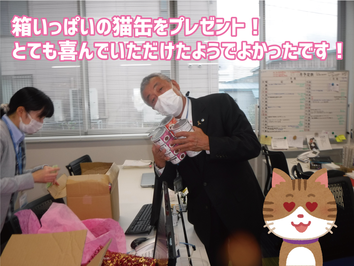 会長は家でたくさんの猫を飼っているということで猫缶をプレゼント🎁