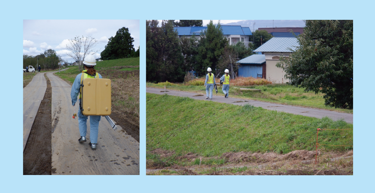 左の写真は、レーザースキャナーを背負っている私です!9月から実際に現場に出て研修しています!