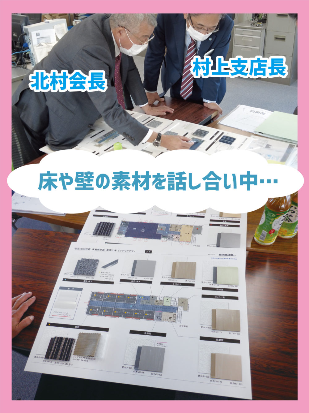 地鎮祭終了後、新社屋の壁紙や床の素材を話し合っていました!
