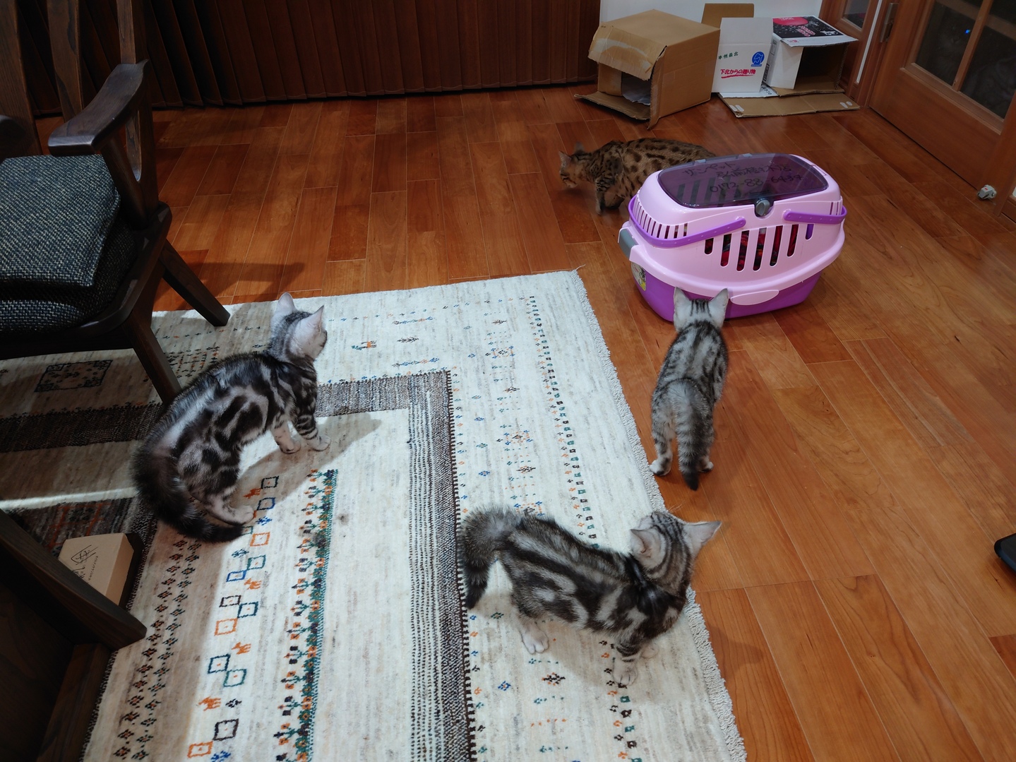新入り猫に子猫たちも興奮?(=^・^=)誰が来たんだ?警戒心マックス、今日は一晩リビングで、、、いまではネコハウスでみんなと過ごしています(=^・^=)