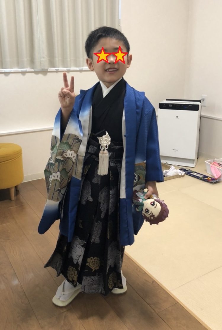 七五三の写真を撮った時です。炭治郎のぬいぐるみを決して放しません笑