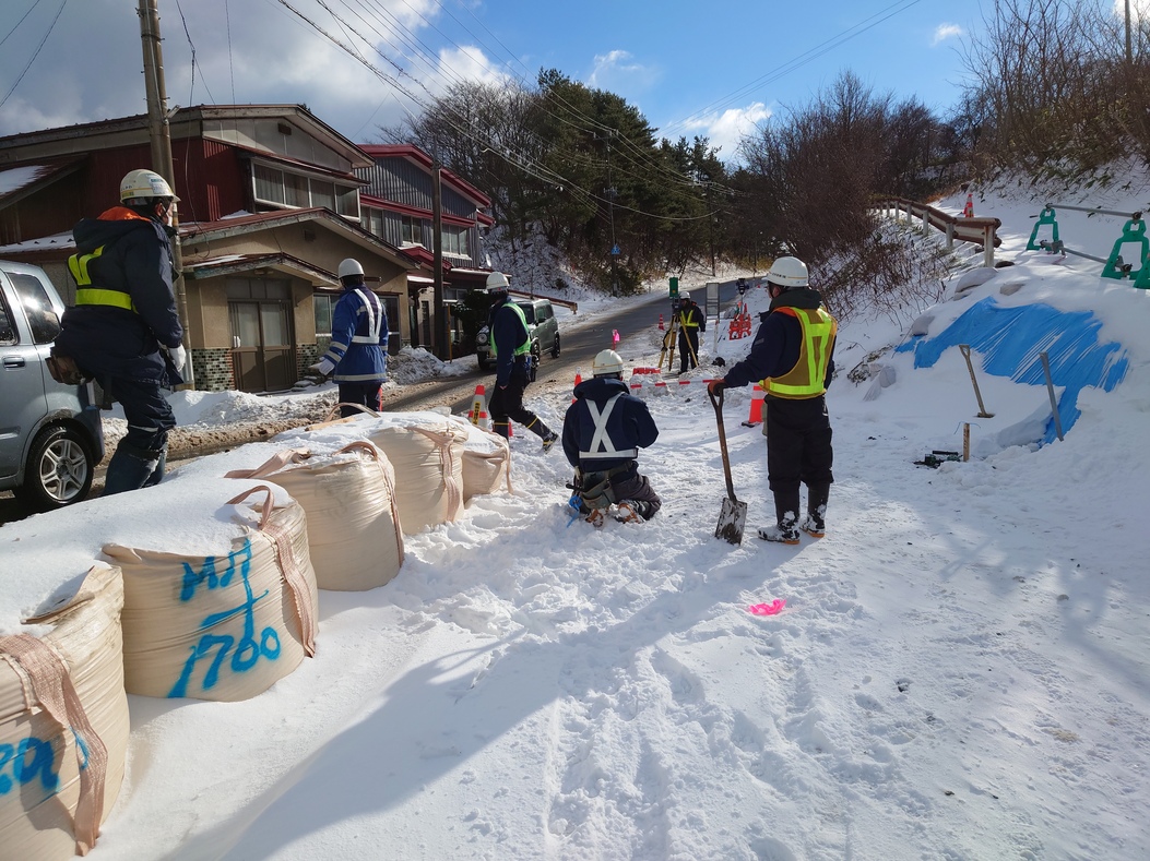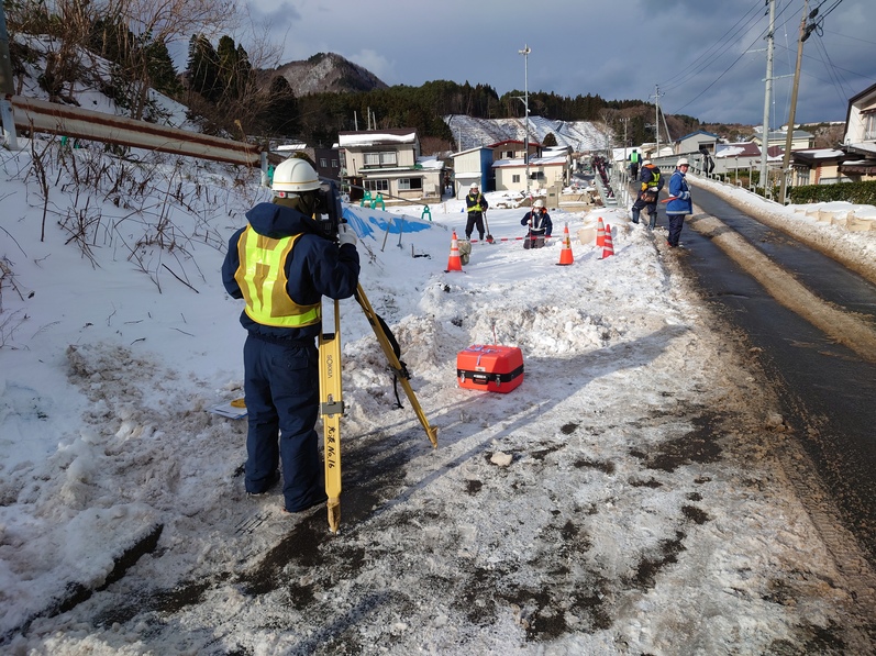 昨年12月27日猛吹雪の中、向かったむつ市大畑町の海岸線沿いの津軽海峡を望む国道279号線災害復旧着工前測量状況、、、今回は私が総指揮命令で一日勝負の総勢10人、ラッキーなことに晴天に変化?一瞬の晴れ間を逃さず