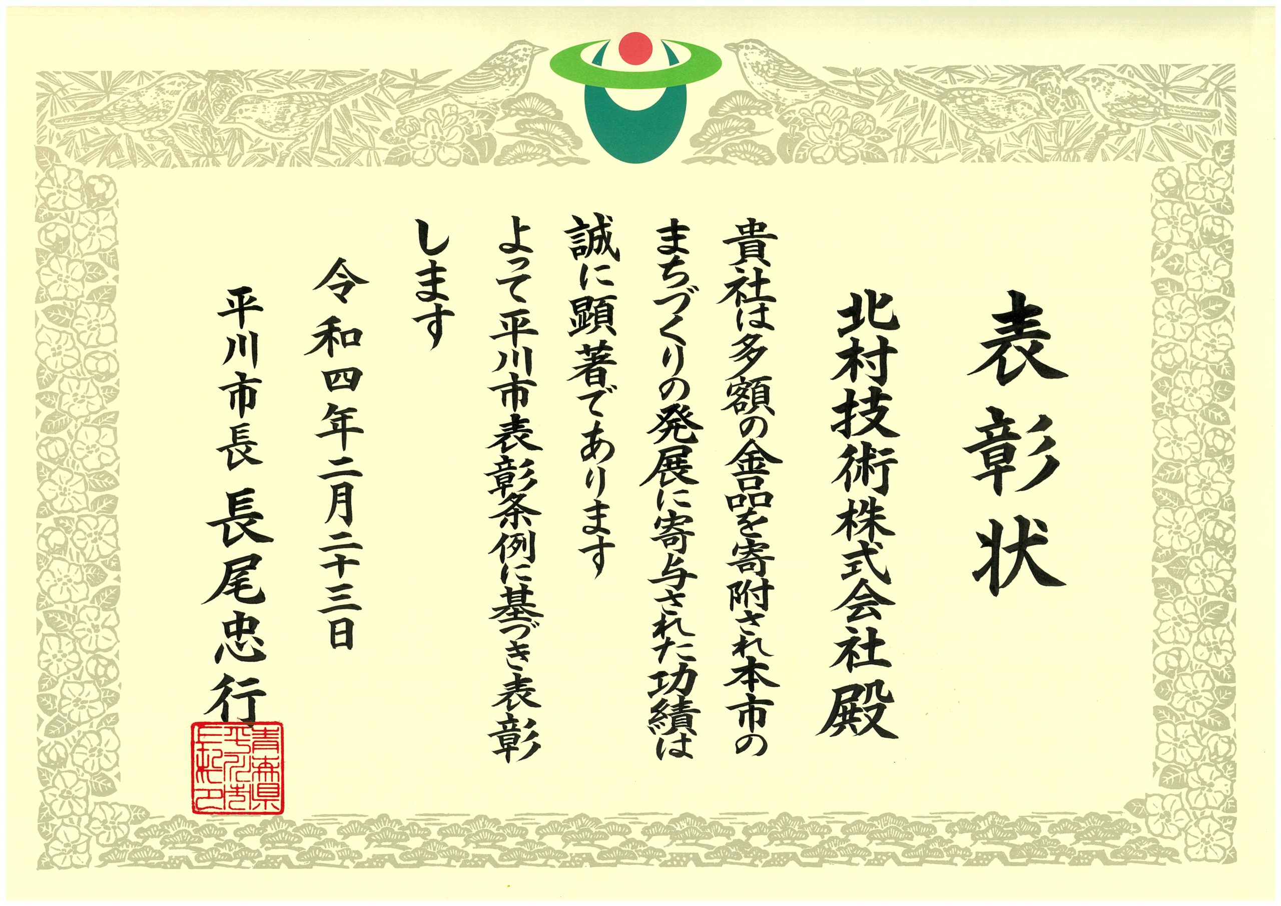 北村技術では昨年6月に「平川市ふるさと納税」に寄付を行なっていました!