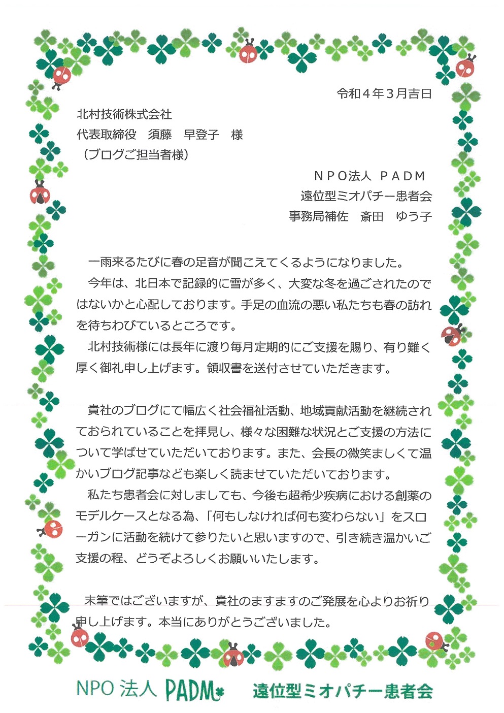 お手紙を頂きましたのでご紹介いたします✉