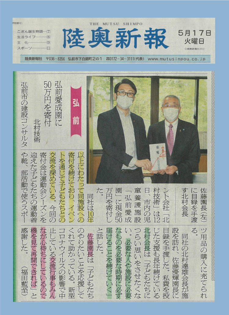 先日行われた弘前愛成園さん寄付金贈呈式の様子を陸奥新報様に掲載していただきました!