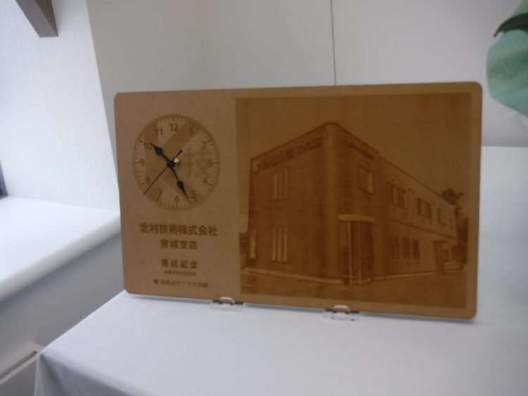 アサヒ印刷さんからはこんなおしゃれな記念品を!支店の外観と時計が印刷されています!