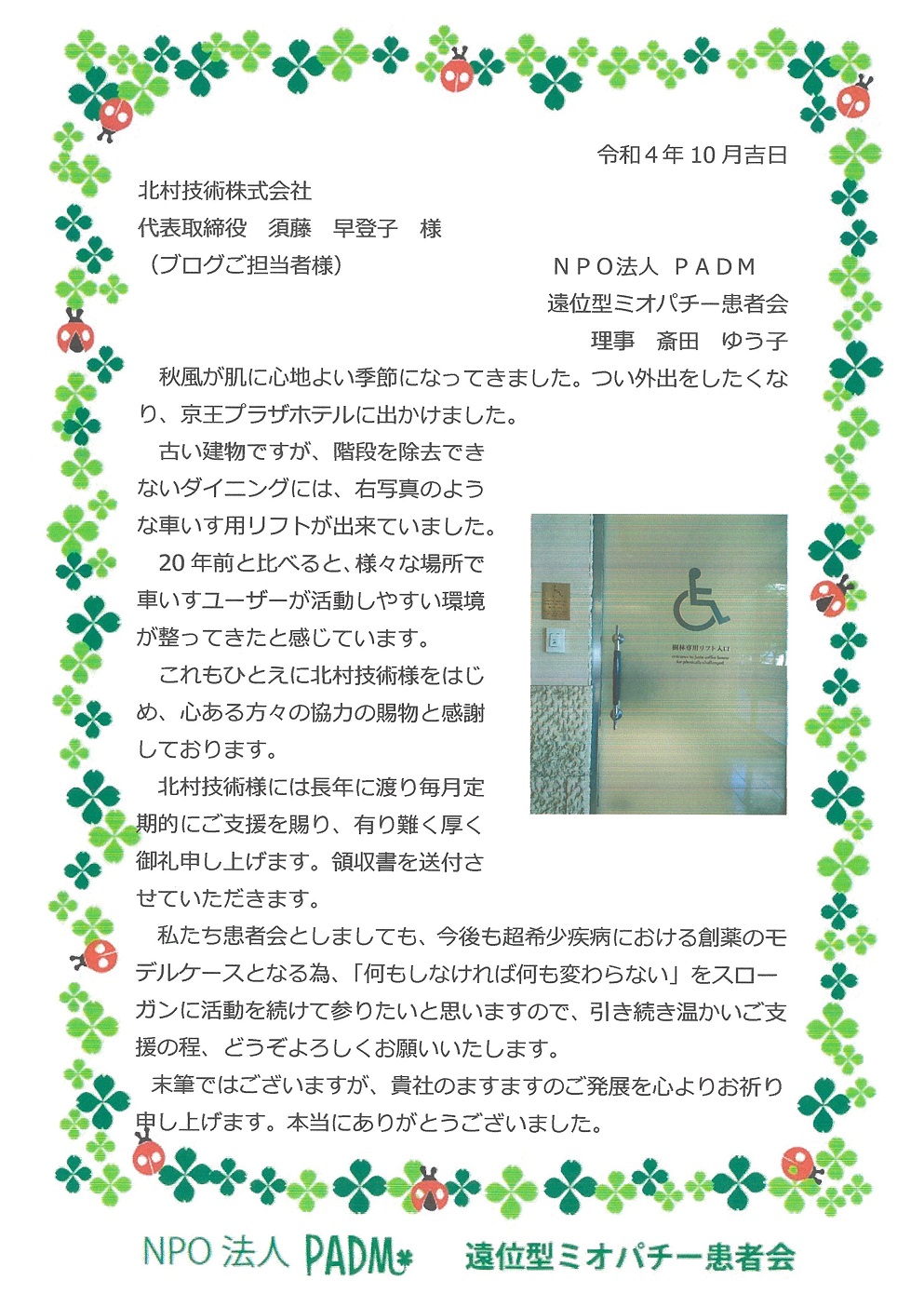 PADM 遠位型ミオパチー患者会さまからお礼状いただきました✨✨