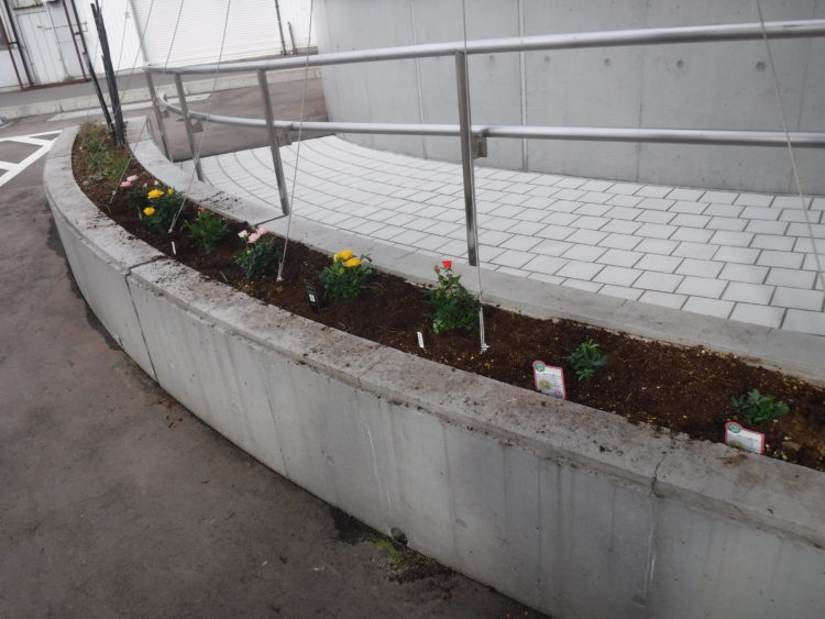 会社のスロープの花壇にはミニバラを植えました🌹