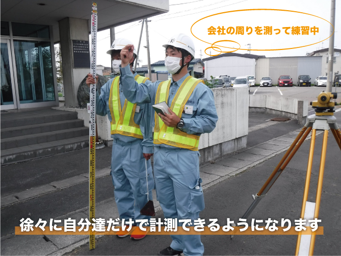 教えてもらったらすぐ現場ではなく、会社の周りを測って何回も練習しています!徐々にスピードも精度も上がってきます➚