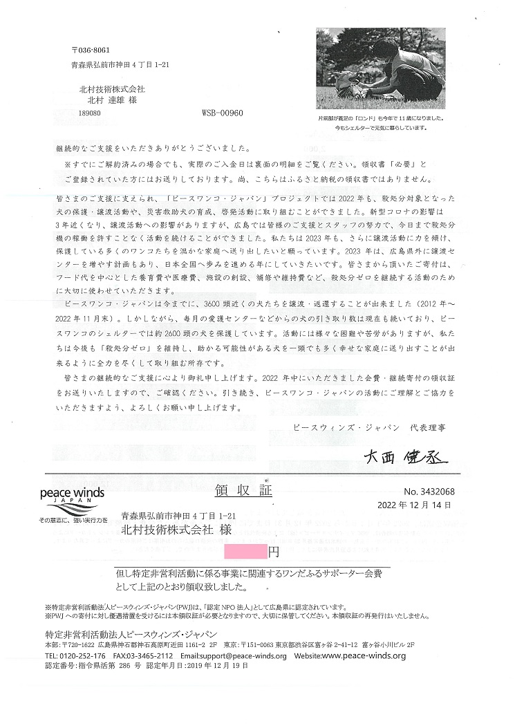 ピースウィンズジャパンさんよりチラシとお礼状が届きました🐶