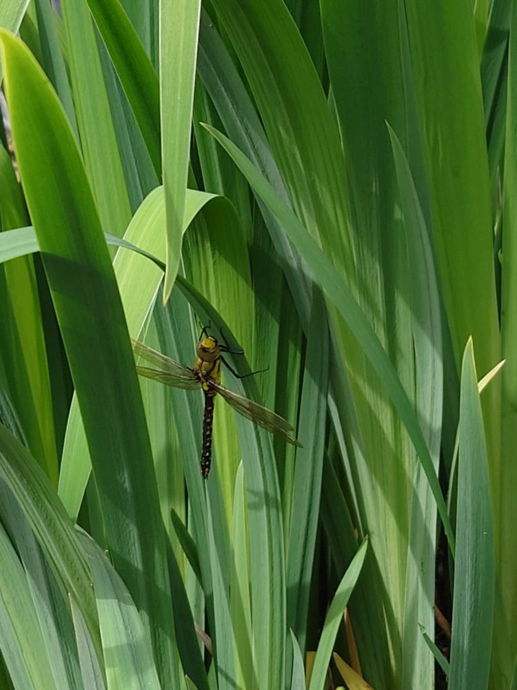 普通のトンボよりいと回り大きな金色が特徴、しっぽがシルバーなのが銀ヤンマ