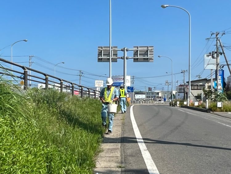 今朝、国道7号線神田バイパス高架橋下交差点付近、社員人男女9で道路のごみ拾いをしました。