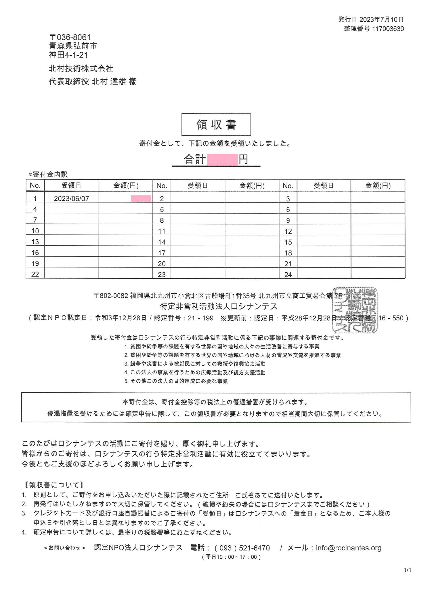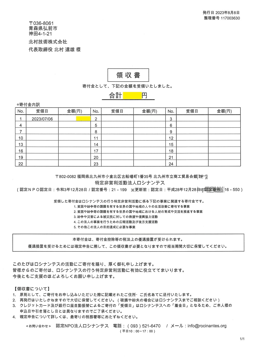 北村技術ではロシナンテス様へ定期的な寄付を行っています。