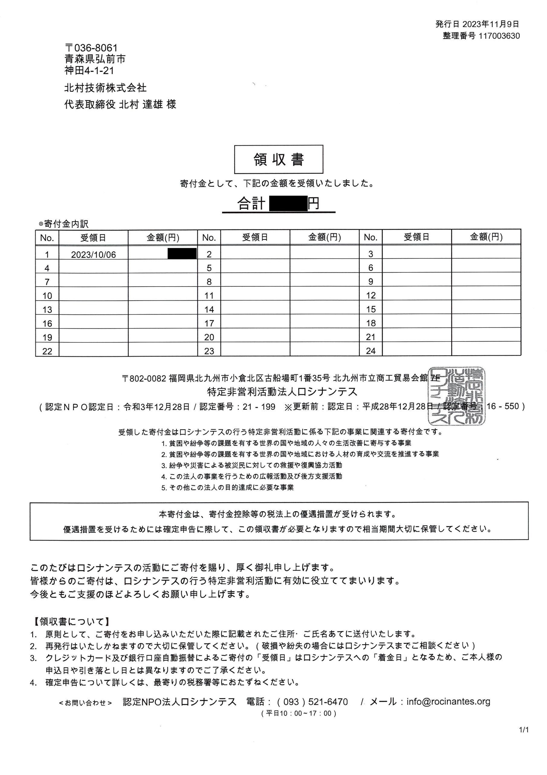 北村技術ではロシナンテス様へ定期的な寄付を行っております。