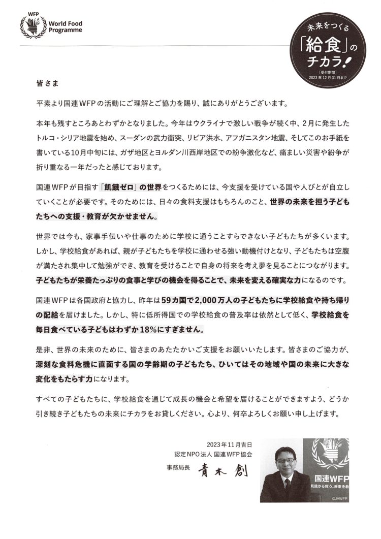 当社では国連WFP協会様に定期的な寄付を行っております。