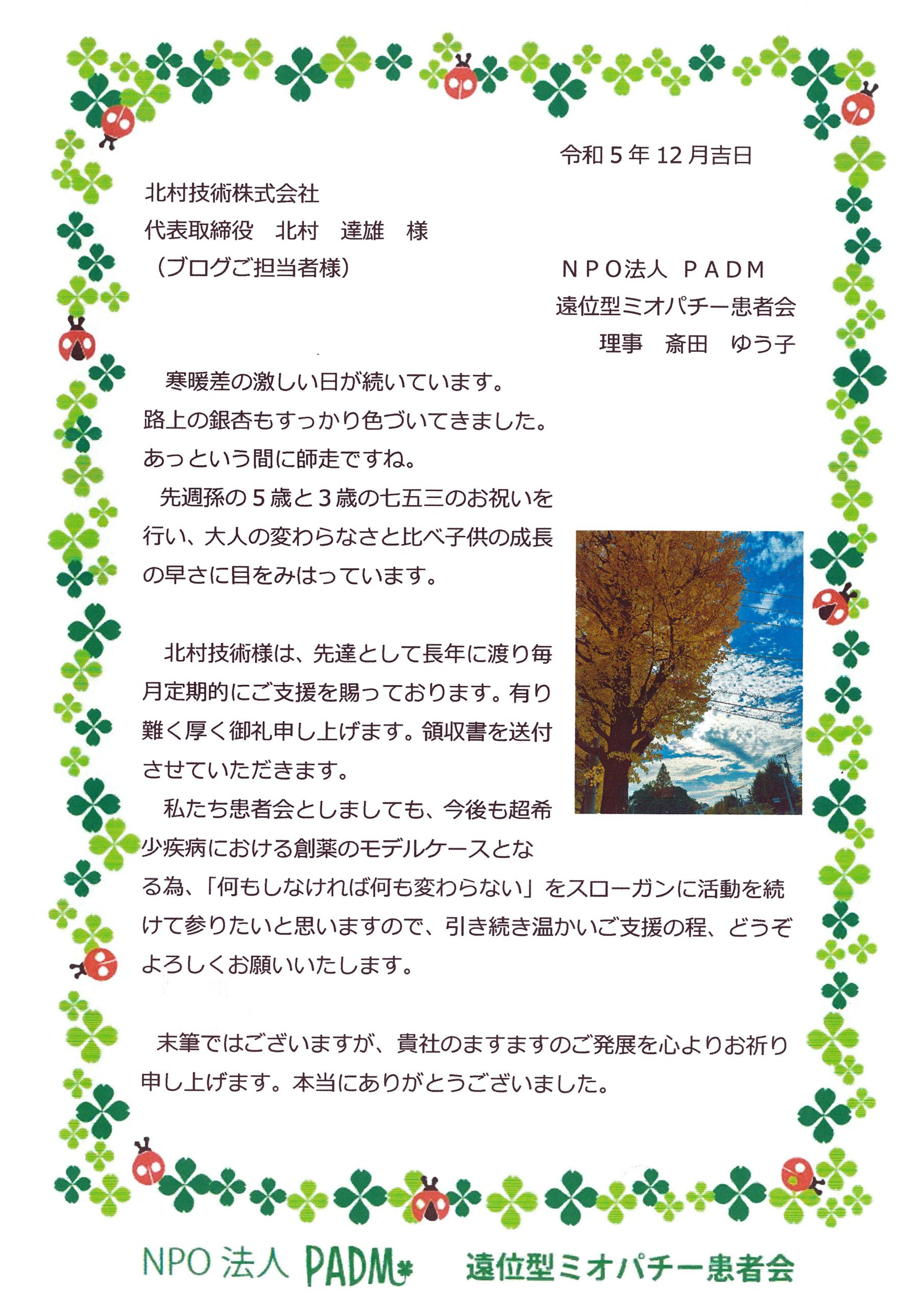 北村技術では遠位型ミオパチー患者会様に定期的な寄付を行っております。