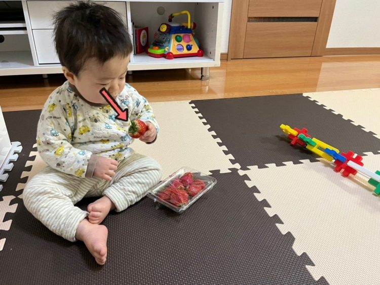 苺を持たせてみました。興味津々です。