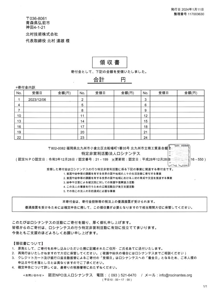 今回はロシナンテス様より領収書が届きましたのでご紹介します。