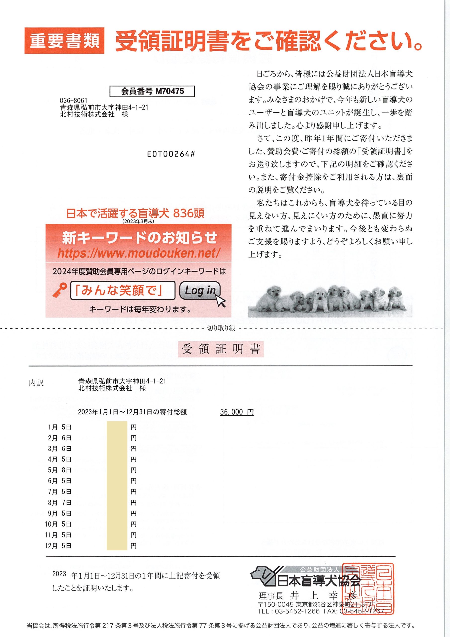 北村技術では日本盲導犬協会様に定期的な寄付を行っておりますります。
