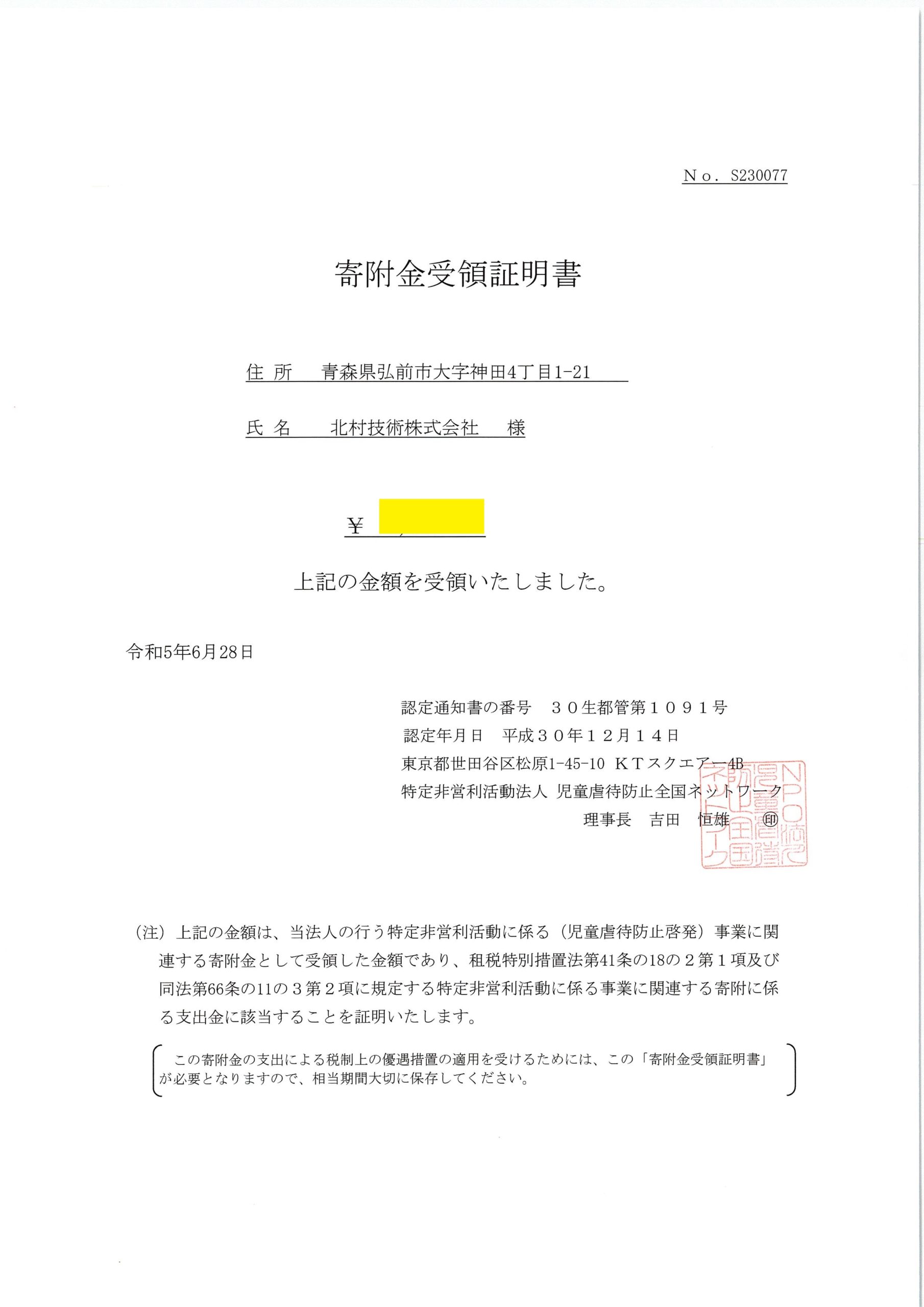 北村技術では児童虐待防止全国ネットワーク様に定期的な寄付を行っております