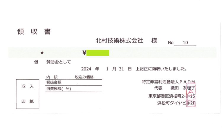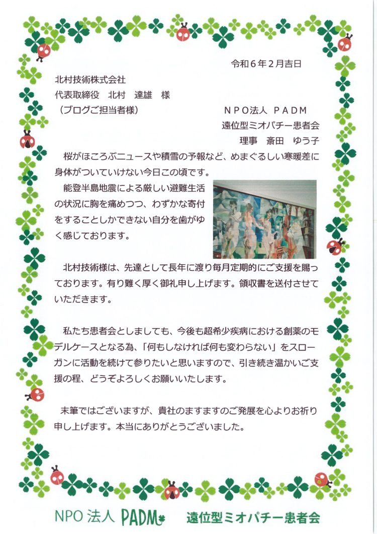北村技術ではNPO法人PADM 遠位型ミオパチー患者会様に定期的な寄付を行っております
