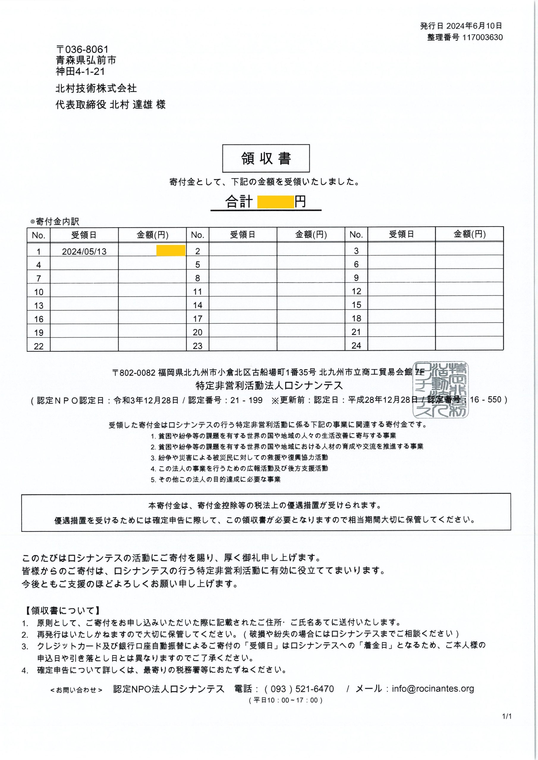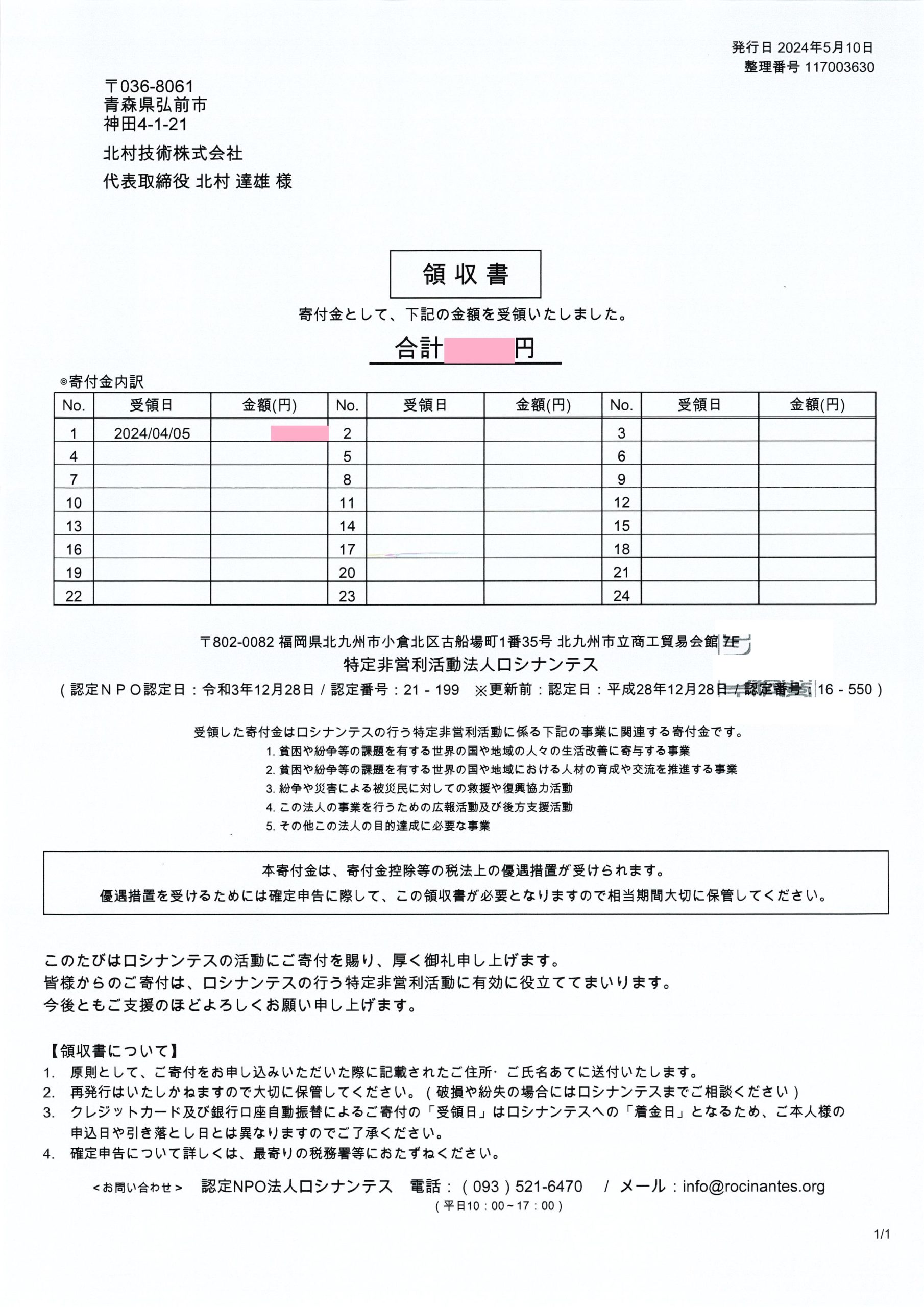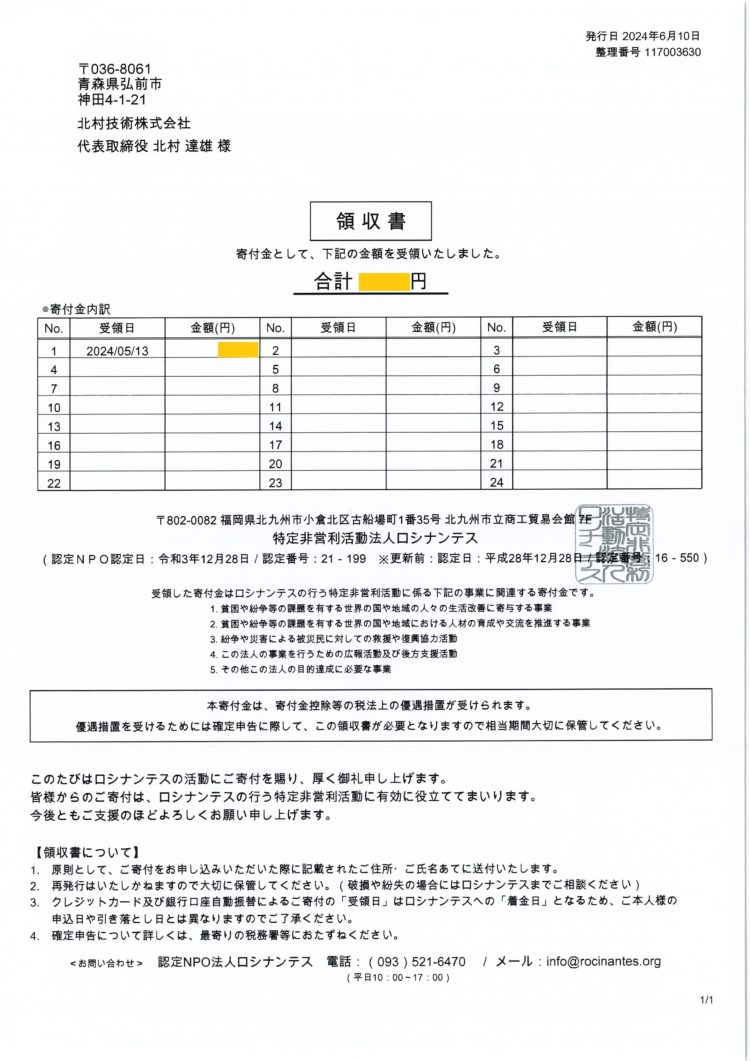 当社ではロシナンテスさんに定期的な寄付を行っております