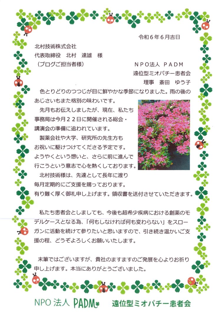 掲載が遅れましたが、今回もPADM 遠位型ミオパチー患者会様より心温まるお手紙を頂きましたのでご紹介いたします💗