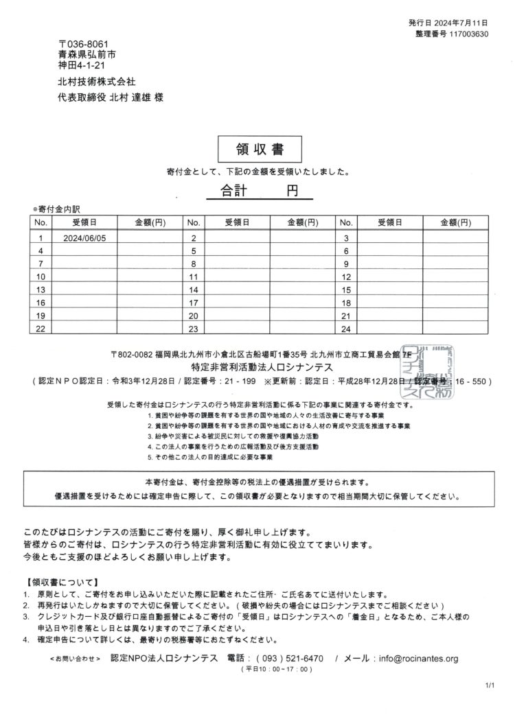 北村技術ではロシナンテス様に定期的な寄付を行っております