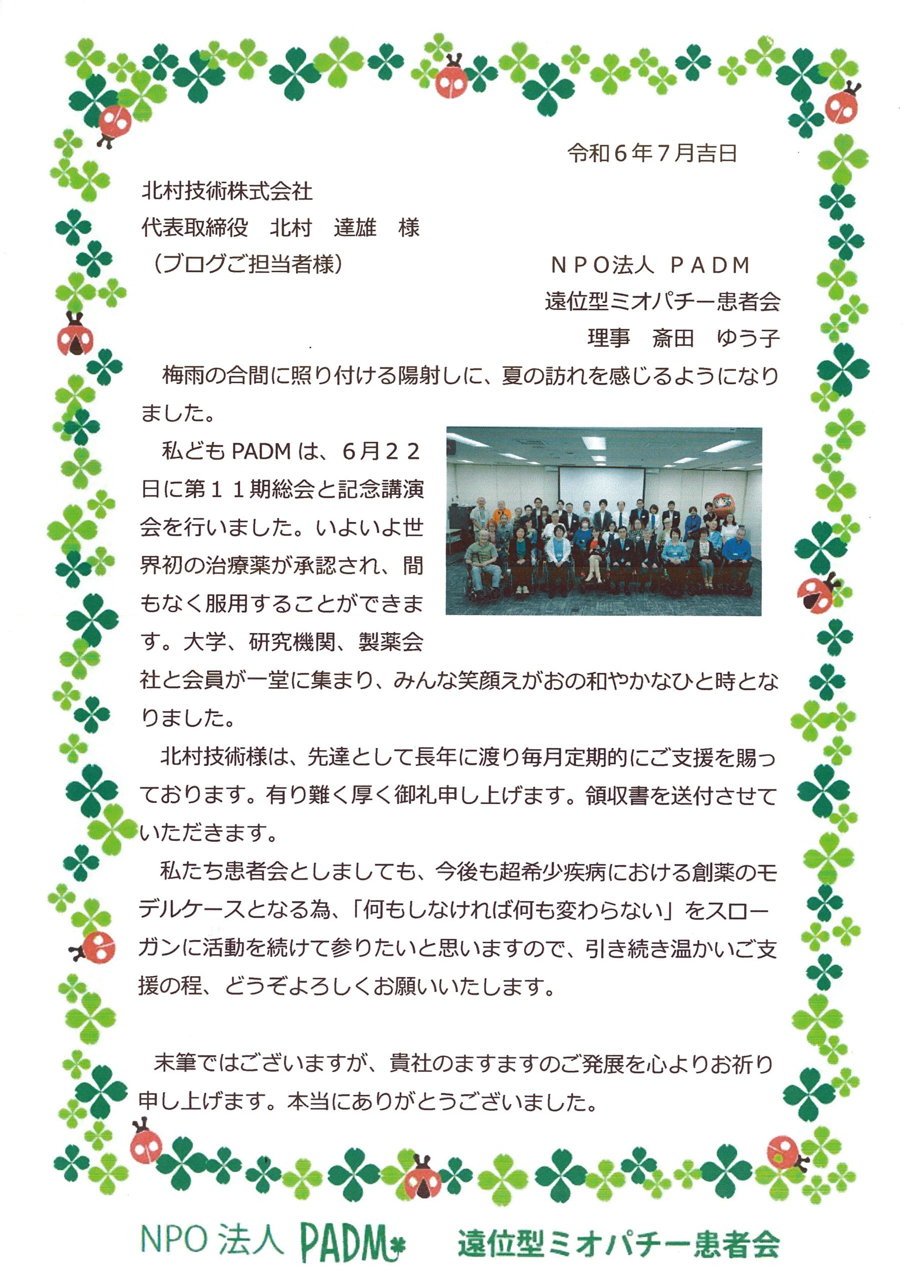 北村技術ではPADM遠位型ミオパチー患者会様に定期的な寄付を行っております
