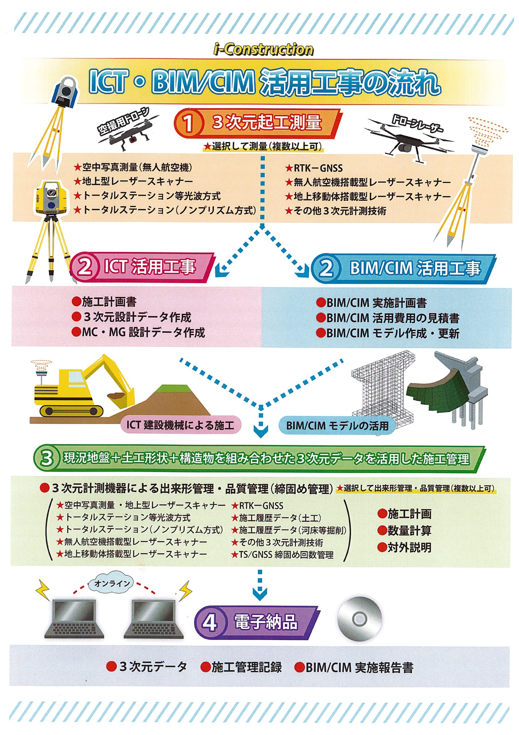 起工測量からUAV、3Dレーザースキャナ、BIM/CIM、MC/MG、設計データ入力、オンライン電子納品、変更図面までお引き受けいたします
