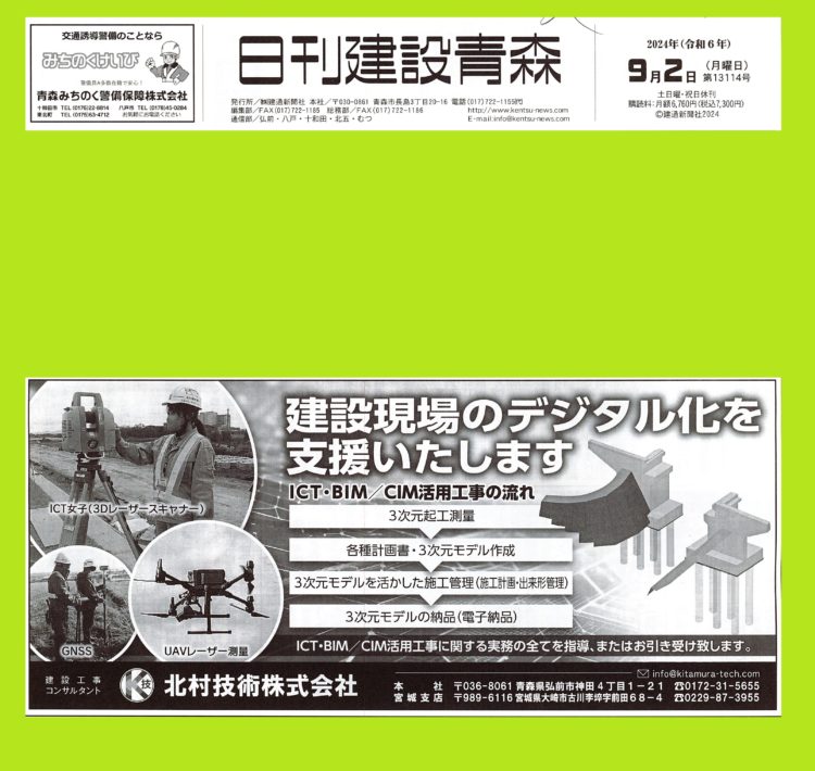 9月2日付の日刊建設青森様に広告を掲載いただきました!