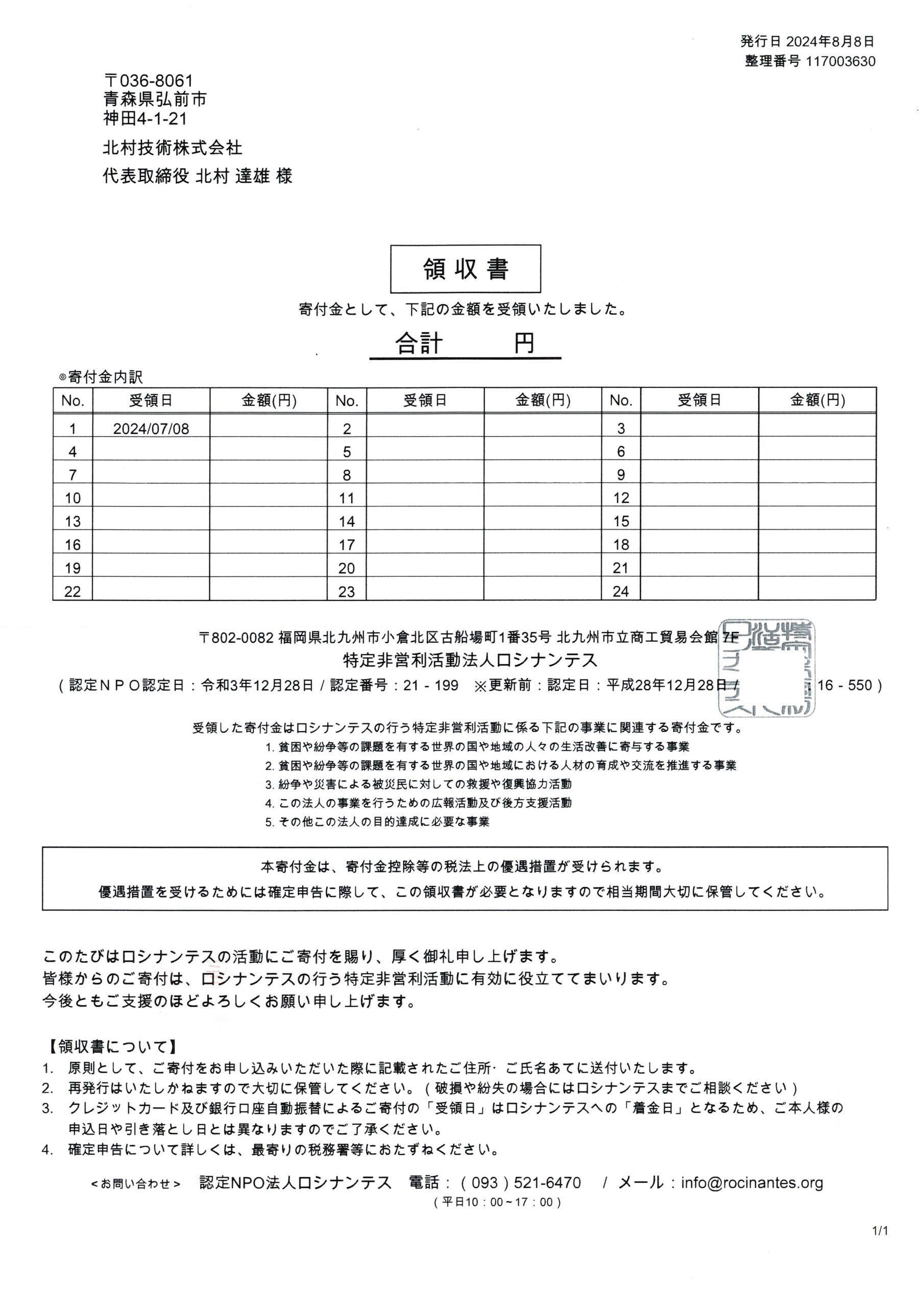 北村技術ではロシナンテス様に定期的な寄付を行っております