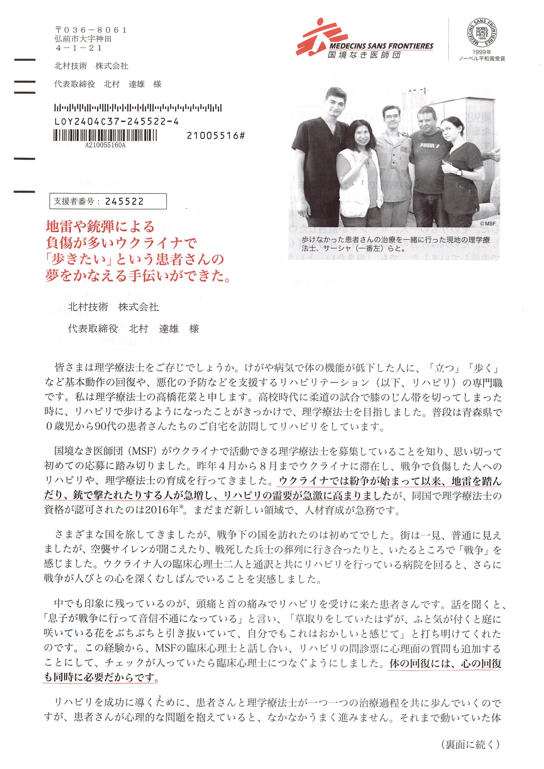 北村技術では国境なき医師団様に定期的な寄付を行っております