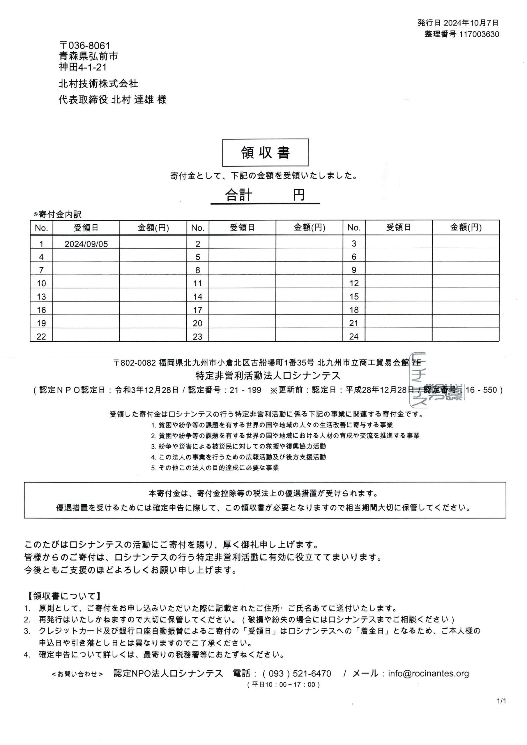 北村技術ではロシナンテスさんへ定期的な寄付を行っております