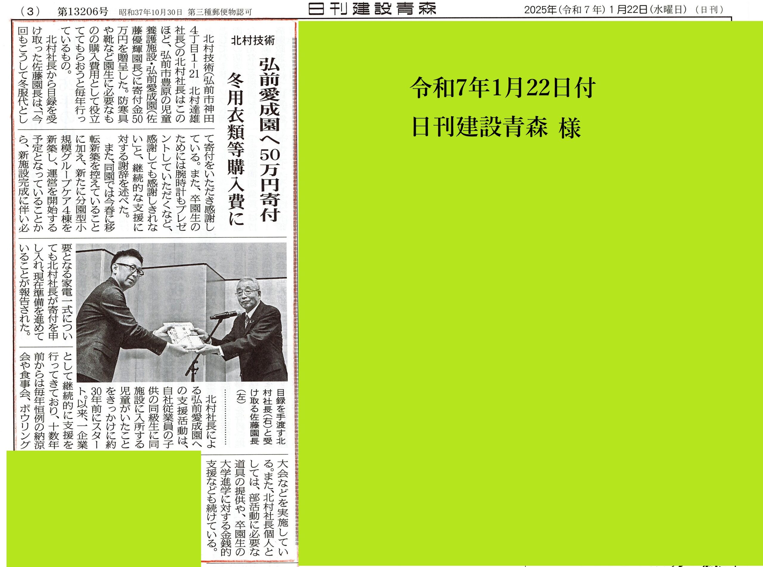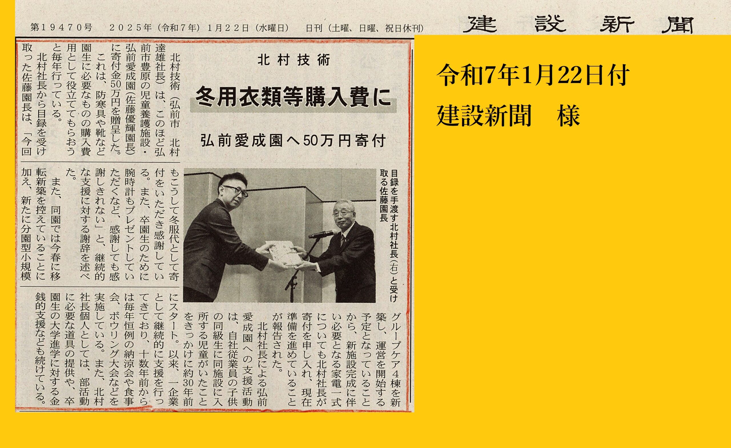 贈呈した際の記事が、建設新聞様、日刊建設青森様に