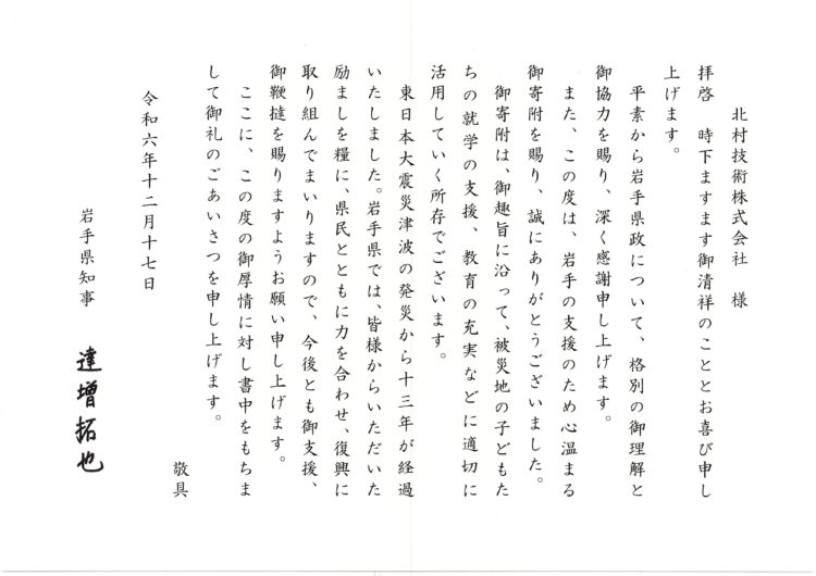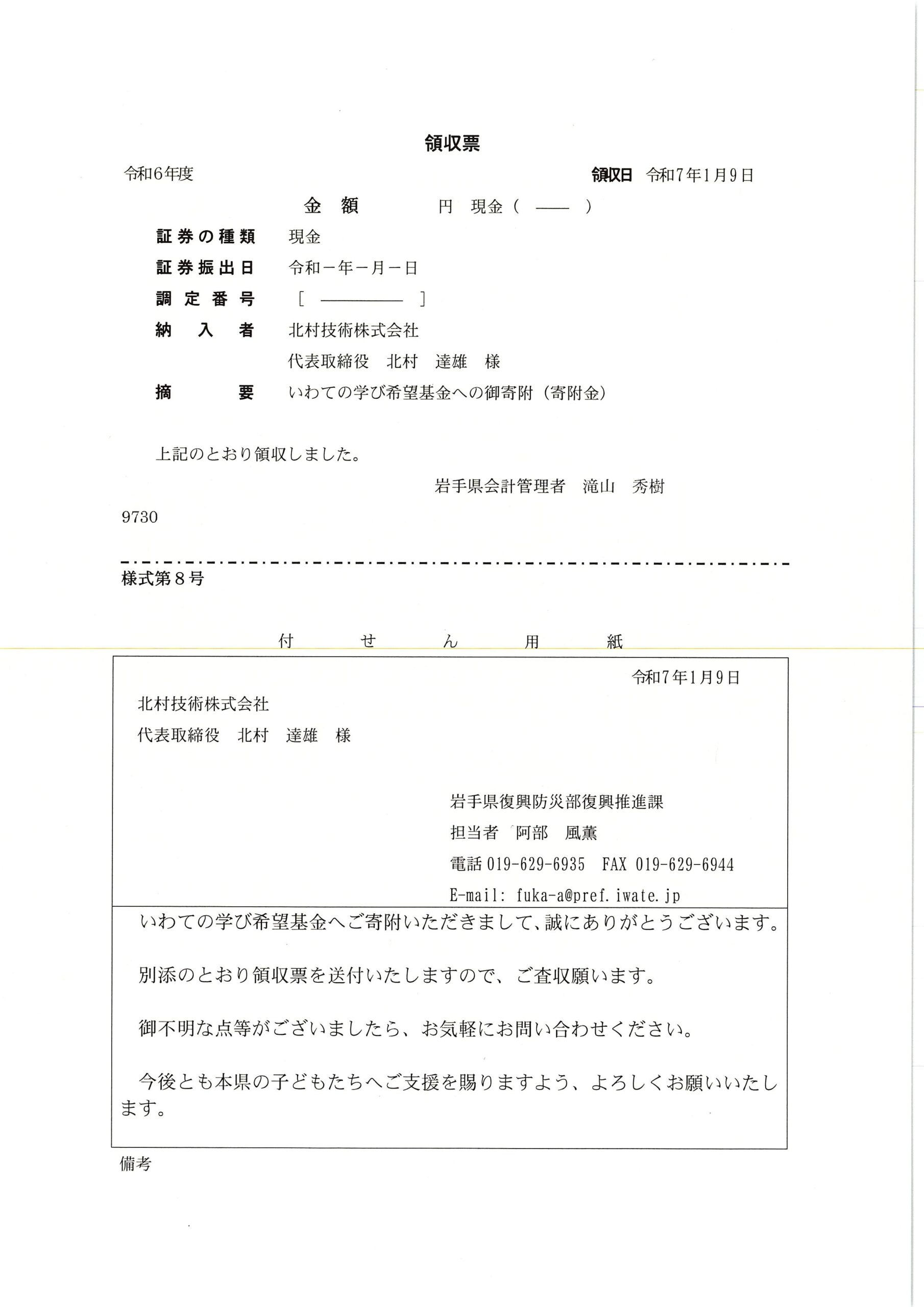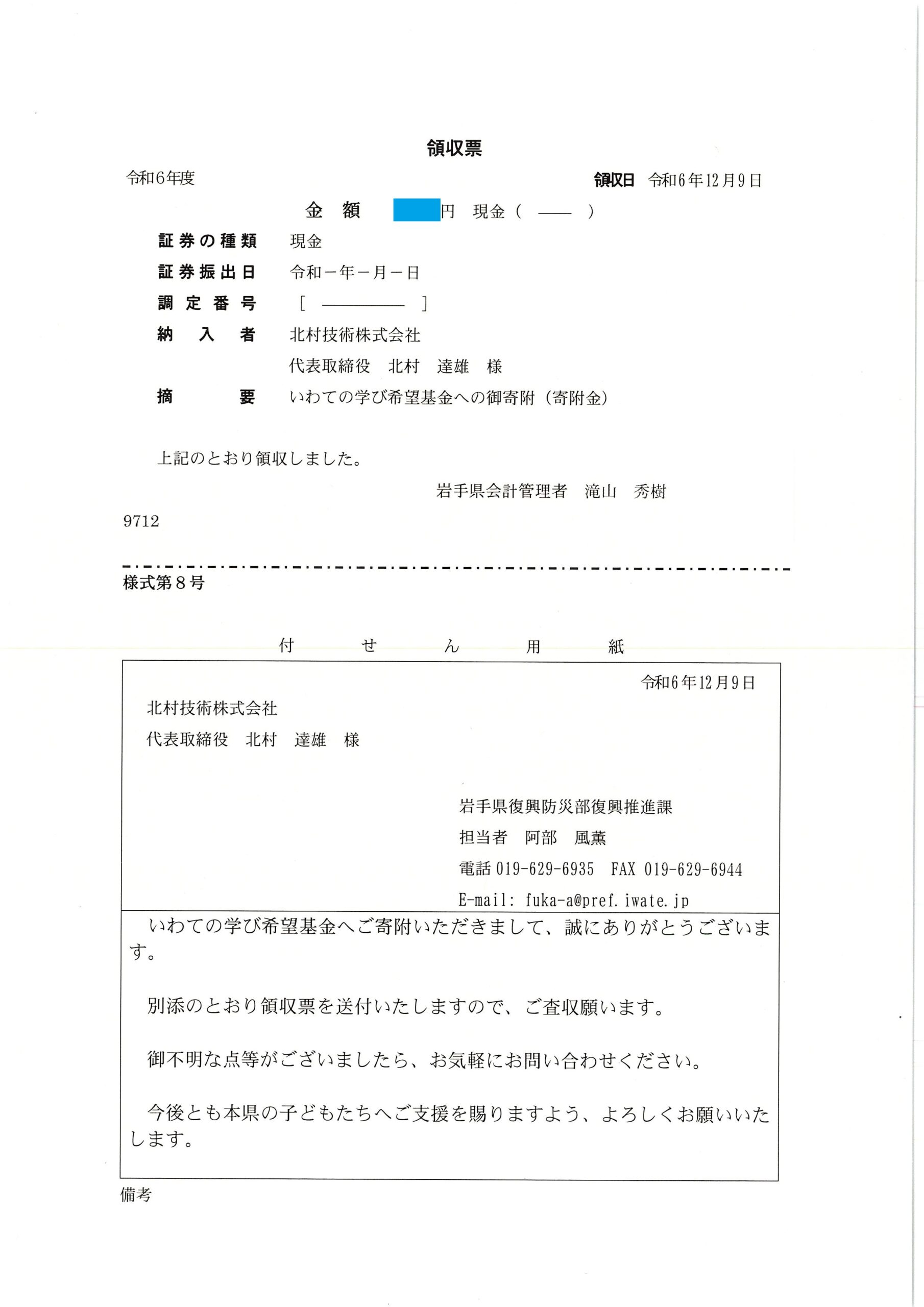 北村技術ではいわての学び希望基金様に定期的な寄付を行っております