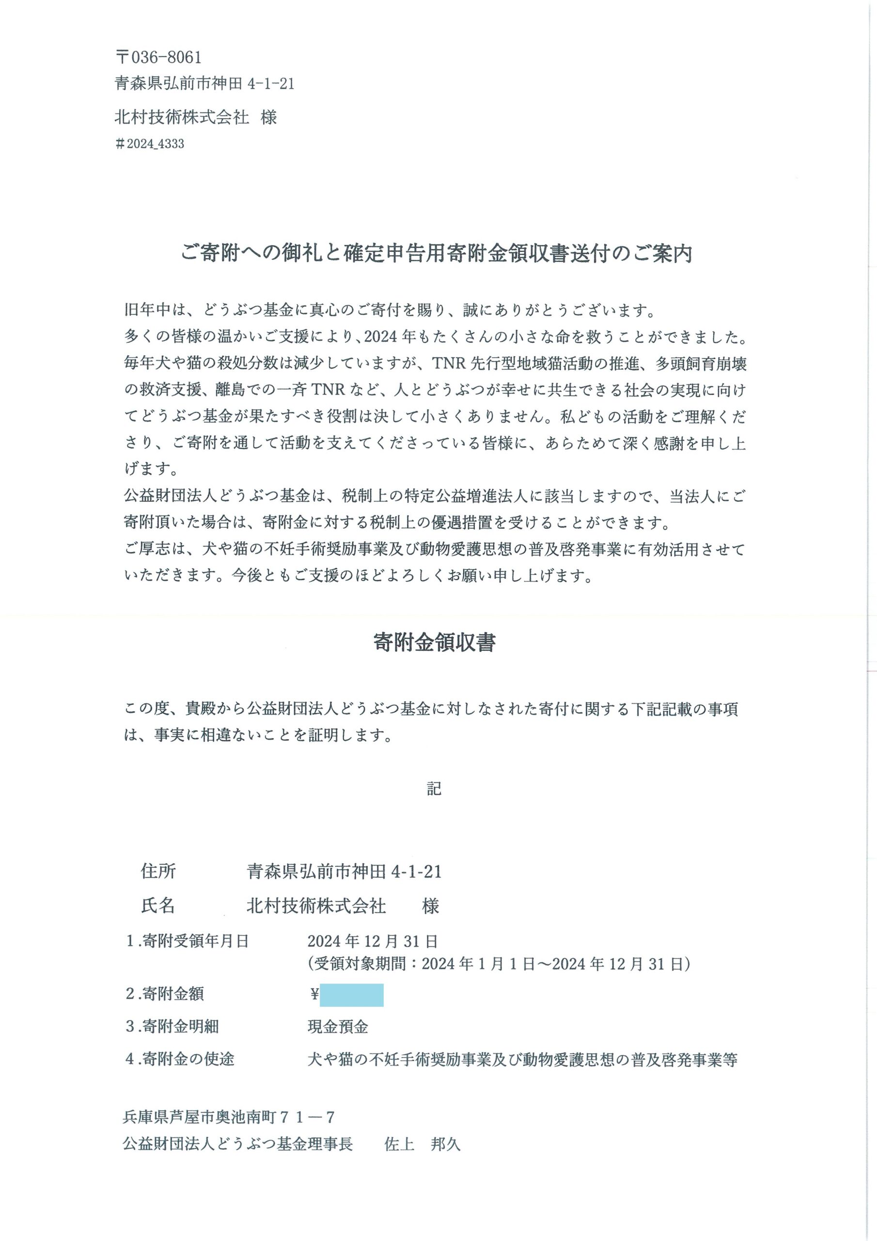 北村技術ではどうぶつ基金様に定期的な寄付を行っております