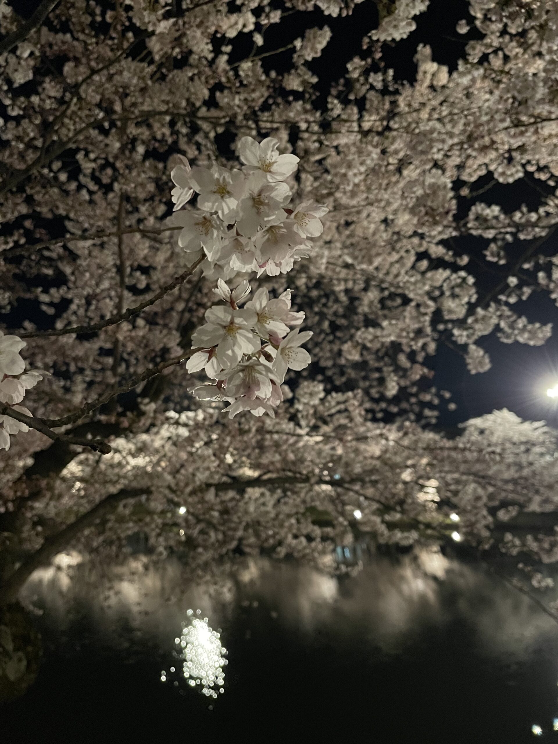 仕事終わりに夜桜を見てきたのですが、外堀が満開、園内もほぼ8割くらい咲いていて(私の体感ですが…)、すごい賑わいでした!